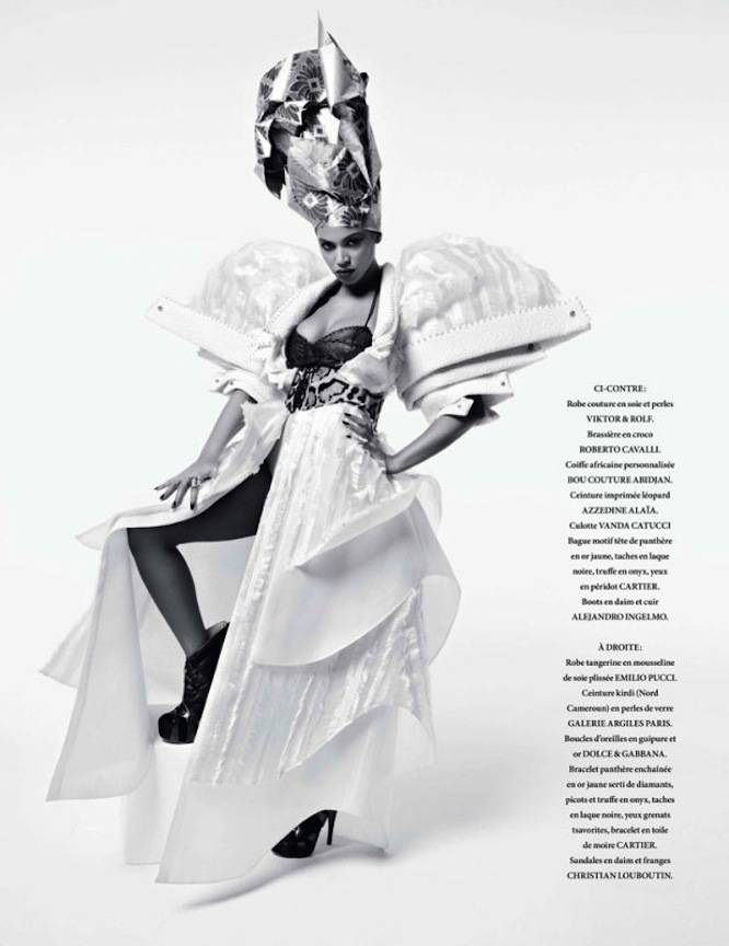 Wearing a variety of African-inspired dresses and jewellery by Gucci, Azzedine Alaia, Fendi, Pucci, Chanel, Louis Vuitton, Rodarte, Dolce & Gabbana, Cartier, and Lanvin. Beyonce’s mom, Tina Knowles, also created a one-of-a-kind couture piece for the shoot.